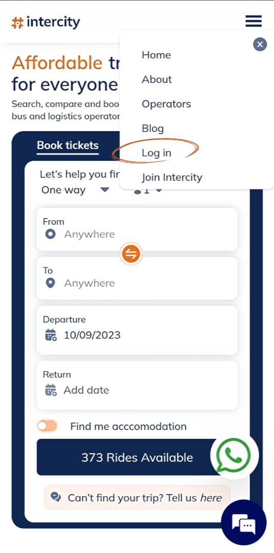 STEP 1 - On intercity.ng home page, click on the menu (three horizontal lines) at the top right.