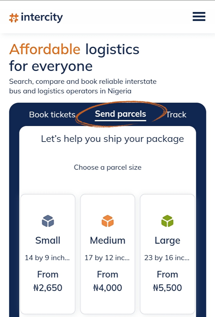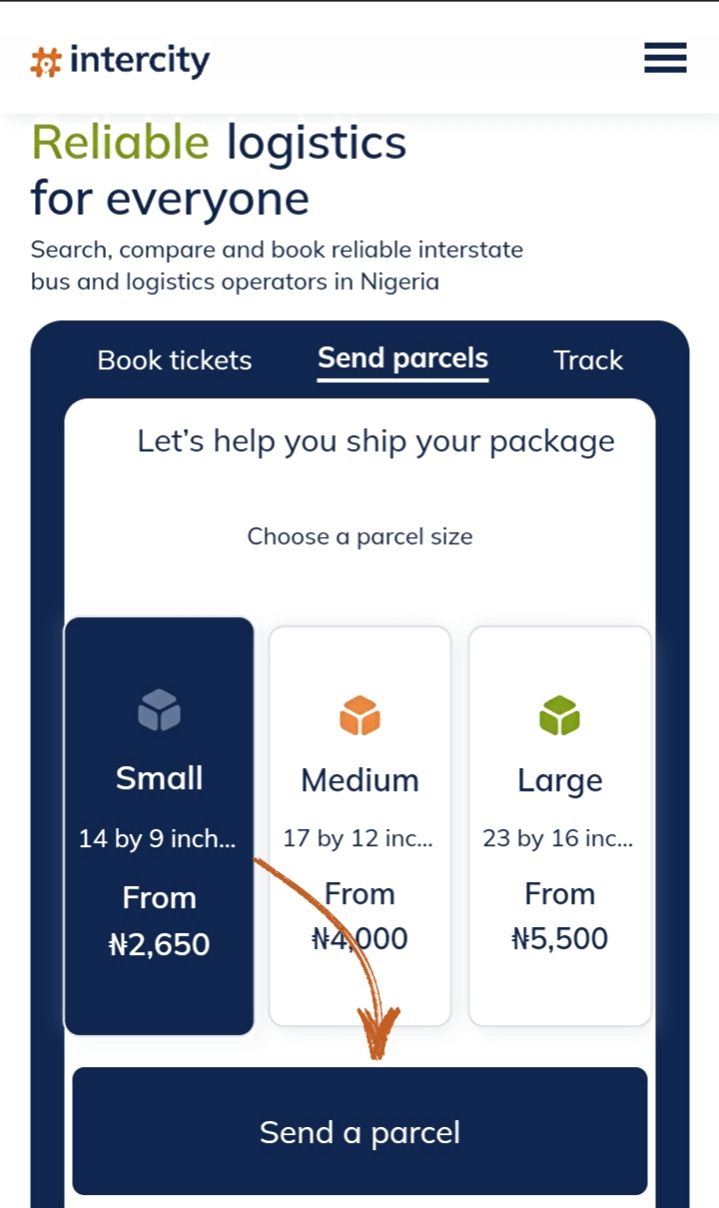 - On the home screen of intercity.ng, click on send parcels at the top of the card